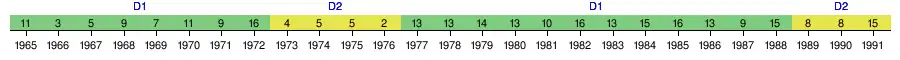 1995–96 | 1 | 20 | 11 | 6 | 3 | 42 | 17 | 39 | W | WC | Qual. | ![]() | ![]() ![]() ![]() | |