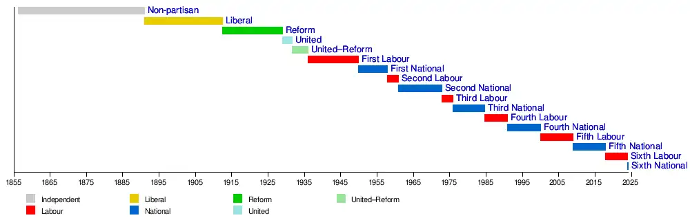 This article lists the successive governments of New Zealand since 1856. The first government which formed along political lines did not appear until 1891, when John Ballance formed the Liberal Party and the Liberal Government.[1] A government is named (by political commentators, as well as self-referentially) for the largest party that leads it[2][3][4] – though compare the United–Reform coalition Government of 1931–1935.