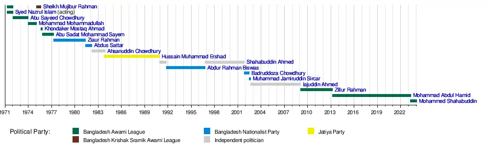 A list published in 2018 by Bdnews24.com appears to coincide with statements made by the country's Election Committee, making Mohammad Abdul Hamid the 20th President when first elected in 2013,[6] yet contradicts the numbering of a list published in 2016 on the President's own official website.[7] The Bangladesh High Commission, Singapore, in 2018 lists him as the 22nd President.[8] Other reports about previous presidents, including some by Bangladesh's newspaper of record the Daily Star, do not correspond with either list.[9][10]