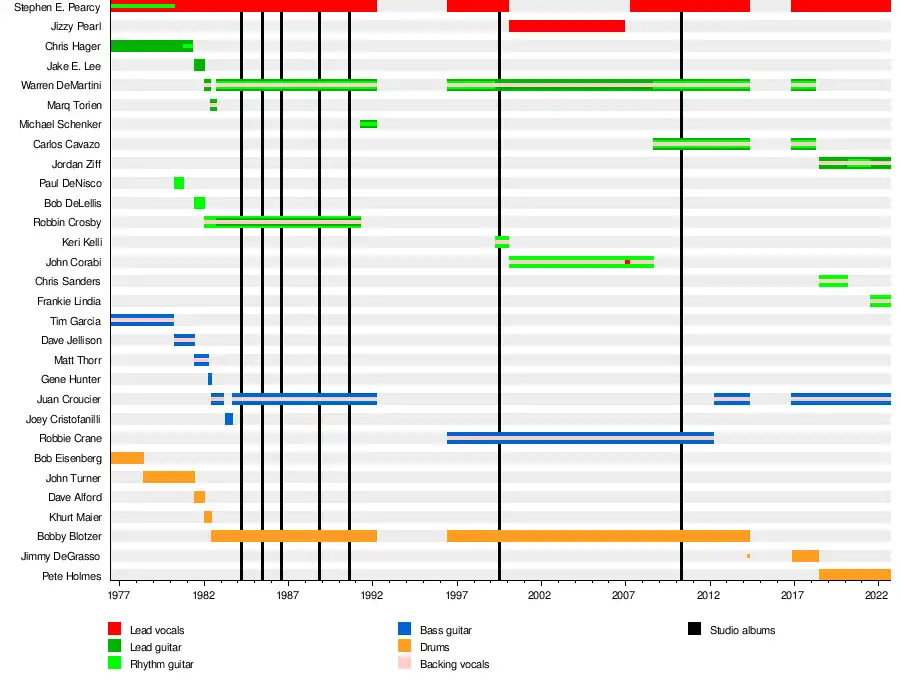 The lineup lasted only a few months, with Alford and Lee quitting after Pearcy fired DeLellis without consulting them.[8] The pair subsequently formed Rough Cutt together.[9] Thorr remained the band's bassist, alongside new additions Warren DeMartini and Robbin Crosby on guitars, and Khurt Maier on drums.[10] This lineup recorded "Tell the World" for the first edition of the Metal Blade compilation Metal Massacre.[11] Thorr was briefly replaced by Gene Hunter,[12] however by the end of the year the group had finalised its classic lineup of Pearcy, DeMartini, Crosby, bassist Juan Croucier and drummer Bobby Blotzer.[13] Marq Torien briefly joined on guitar in 1982.[14] Joey Cristo fanilli temporarily took over from Croucier in 1983, but he returned once he left Dokken later in the year.[15]