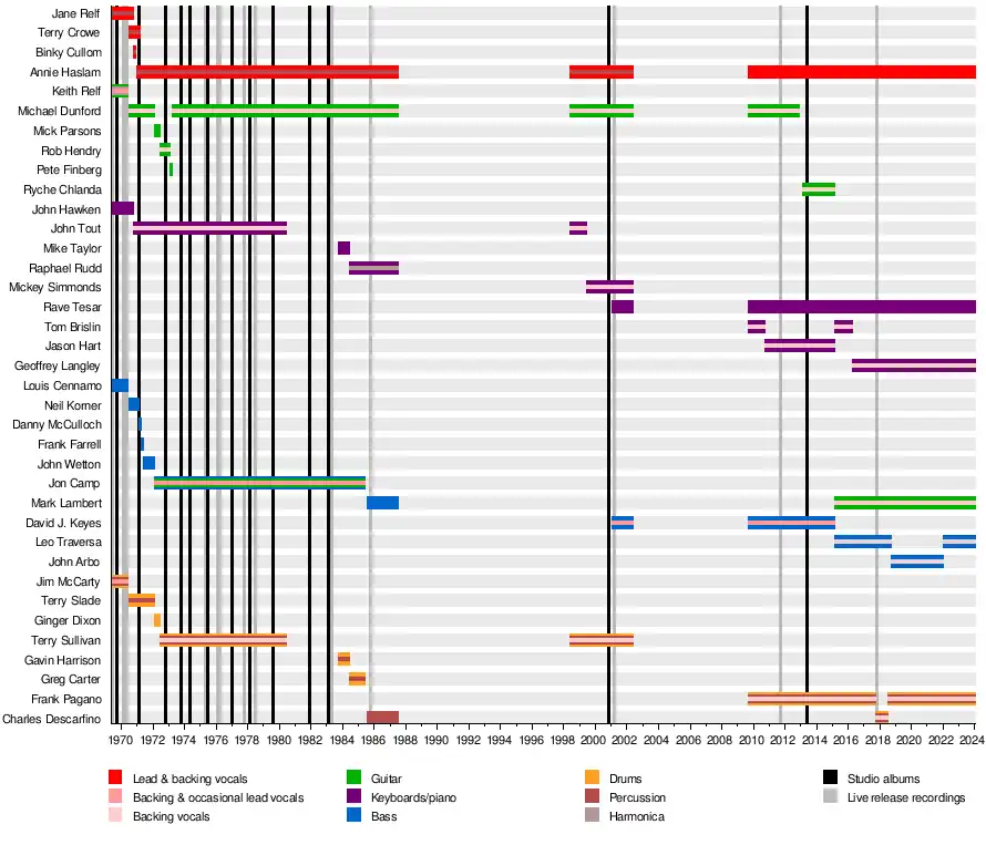 By October 2010, Brislin had been replaced by Jason Hart.[25] On 20 November 2012, Dunford died after suffering a cerebral hemorrhage.[26] Despite the loss of a central member, Haslam assured that Renaissance would continue, and the following February it was announced that Ryche Chlanda would take over as the band's guitarist.[27] Grandine il vento, a new studio album recorded prior to Dunford's death, was released a few months later.[28] In 2015, Chlanda, Keyes and Hart were replaced by Mark Lambert, Leo Traversa and Tom Brislin, respectively.[29] The following year, Brislin was replaced again by Geoffrey Langley.[30] Charles Descarfino replaced Pagano in 2017 for an orchestral tour,[31] although by 2018 the drummer had returned to the band.[32] Later in the year, John Arbo replaced Traversa on bass.[23]