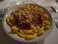 Pasta chi Vrocculi Arriminati | ![]() | a pasta dish from Palermo which generally consists of a long pasta like spaghetti or bucatini, cauliflower, onion, raisins, anchovies, pine nuts, saffron, red chili, and breadcrumbs |