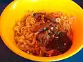 Noodle dish | Katong Laksa is a variant of laksa lemak inspired by the Straits Chinese who live in the Katong area, Singapore. It has a spicy soup stock the colour of a flaming sunset, flavoured with coconut milk and dried shrimp, and topped with ingredients like cockles, prawns and fishcake. The noodles are normally cut up into smaller pieces so that the entire dish can be eaten with a spoon alone, without chopsticks or a fork.[3] |