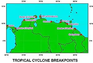 In the event an Atlantic hurricane threatens the northern coast of South America, the National Hurricane Center defines nine locations as tropical cyclone warning breakpoints. The westernmost is the border between Panama and Colombia, and the easternmost is Georgetown, Guyana, located at 6.82° N. In the eastern Pacific Ocean, tropical cyclone warning breakpoints extend eastward to the border of Panama and Colombia at 7.23° N.[72] No Atlantic hurricane has existed south of 6.82° N,[73] and no Pacific hurricane has existed east of 80° W,[74] though in the event a tropical cyclone threatens a region of South America without warnings, additional warning sites can be selected. In addition to warnings on the mainland of South America, the National Hurricane Center defines the entire island of San Andres as a tropical cyclone warning breakpoint.[72]