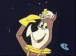 Astro (voiced by Don Messick in the TV series, Daws Butler in The Jetsons in First Family On The Moon,[19][20] Scott Innes in several RadioShack commercials, Wally Wingert in Harvey Birdman, Attorney at Law and an LG Electronics commercial,[3][4] Jeff Bergman in a Tums commercial,[21] Frank Welker in The Jetsons & WWE: Robo-WrestleMania, 2017–present) is the Jetson family's Great Dane. He was designed by Iwao Takamoto, and originally voiced by Don Messick. Despite the stress he tends to cause him, George often regards Astro as his genuine best friend. Astro, despite being clumsy and dim-witted, was very loyal (to a fault) to the Jetsons, particularly George and Elroy. A GMO he was more advanced than present-day dogs, in that he had a rudimentary grasp of the English language.[22] In a recurring gag, while George is walking Astro on a gravity-suspended treadmill, Astro begins chasing a cat that stumbles onto it, eventually forcing it to go at speeds too fast for George to keep up with, trapping him. This led to George's trademark phrase "Jane! Stop this crazy thing!".