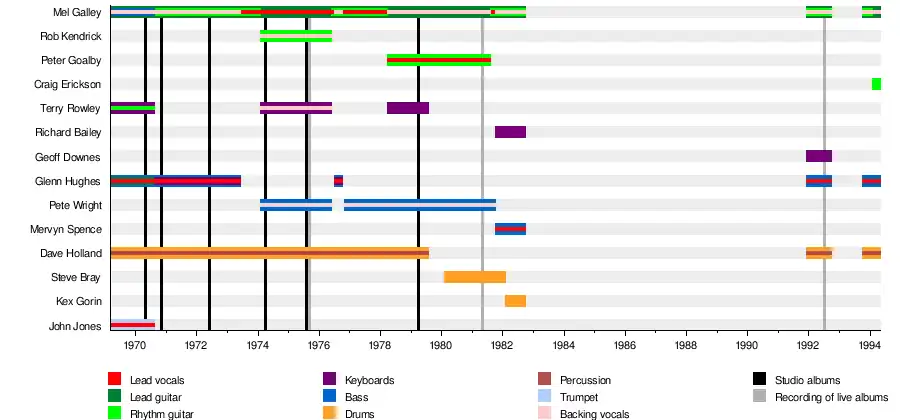 Trapeze were an English rock band from Cannock, Staffordshire. Formed in March 1969, the band originally featured former The Montanas members John Jones (vocals, trumpet) and Terry Rowley (keyboards, guitar, flute), as well as former Finders Keepers members Mel Galley (guitar, vocals), Glenn Hughes (bass, piano, vocals) and Dave Holland (drums).[1] After the band released their self-titled debut album in May 1970, Jones and Rowley left to return to The Montanas.[2] Hughes, Galley and Holland released Medusa later in the year and You Are the Music... We're Just the Band in 1972,[1] before Hughes left to join Deep Purple in June 1973.[3] Prior to his departure, Hughes was due to switch to the role of second guitarist, with Pete MacKie set to take his place on bass;[4] however, this never came to fruition.[5]