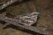 Nightjars are medium-sized nocturnal birds that usually nest on the ground. They have long wings, short legs and very short bills. Most have small feet, of little use for walking, and long pointed wings. Their soft plumage is camouflaged to resemble bark or leaves.
