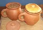 Beanpot A deep, wide-bellied, short-necked vessel used to cook bean-based dishes Beanpots are typically made of ceramic, though pots made of other materials, like cast iron, can also be found. The relatively narrow mouth of the beanpot minimizes evaporation and heat loss, while the deep, wide, thick-walled body of the pot facilitates long, slow cooking times. They are typically glazed both inside and out, and so cannot be used for clay pot cooking.