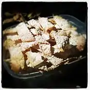Cenci | Italy | And Donzelle in Tuscany- Chiacchiere (also called cenci - lit. 'rags') can be served with honey on top (or powdered sugar). Donzelle are stripes of fried bread dough, usually served with ham and mozzarella. | |