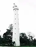 12-sided cast iron tower painted in white. It contains a lantern and a gallery.[7] |