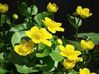 Caltha palustris | Commonly known as marsh-marigold and kingcup. | It contains several active substances of which the most important from a toxicological point of view is protoanemonin. Ingesting large quantities of the plant may cause convulsions, burning of the throat, vomiting, bloody diarrhea, dizziness, and fainting. Contact of the skin or mucous membranes with the juices can cause blistering or inflammation, and gastric illness if ingested. Younger parts seem to contain lower toxin concentrations and heating breaks these substances down. Small amounts of Caltha in hay do not cause problems when fed to livestock, but larger quantities can lead to gastric illness.[51] | ![]() |
