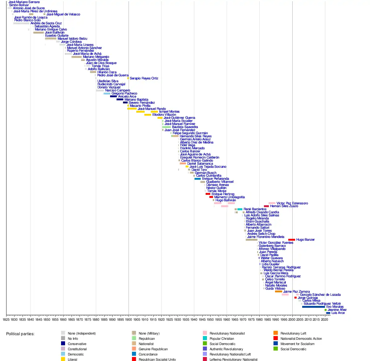 22 presidents were deposed in 23 coups d'état (1839, 1841; twice, 1848; twice, 1857, 1861, 1864, 1871, 1876, 1879, 1920, 1936, 1937, 1943, 1964, 1969, 1970, 1971, 1978; twice, 1979, and 1980). Velasco was deposed twice in 1841 and December 1848. Additionally, the Council of Ministers of Hernando Siles Reyes was deposed in 1930. Three presidents were deposed by a civil war, a popular uprising, and a revolution. Transmissions of command from one de facto government to another de facto government occurred in seven cases (1841, 1946, 1965, 1966, 1981; twice, and 1982). Two special cases occurred in 1939 when Carlos Quintanilla was installed by the military after the death of Germán Busch and in 1951 when President Mamerto Urriolagoitía resigned in a self-coup in favor of a military junta. Two unconstitutional successions occurred in 1930 when Hernando Siles Reyes entrusted command to his council of ministers and 1934 when Daniel Salamanca was ousted in favor of his vice president, José Luis Tejada Sorzano.[3] Finally, some supporters of Evo Morales claim that he was ousted by a coup d'état and that the presidency of Jeanine Áñez was an unconstitutional succession of power. However, this is disputed.[4]