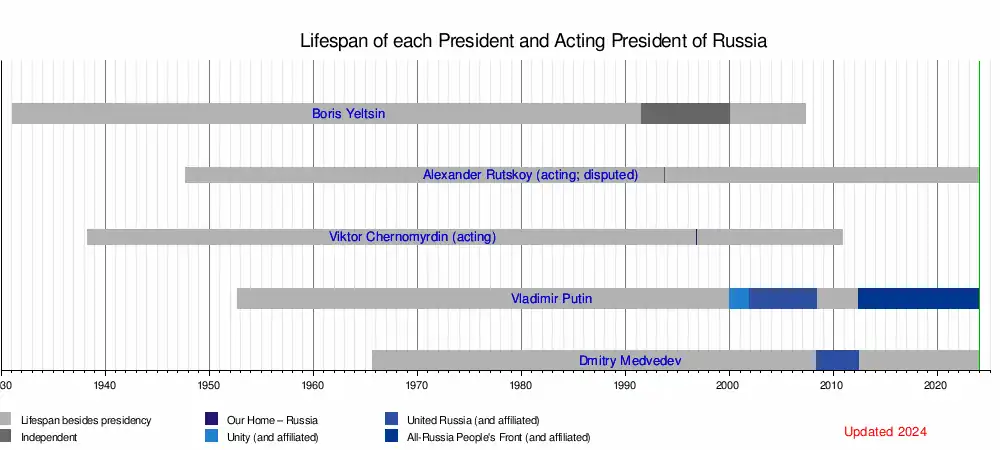 - ↑ Elected as President of the Russian SFSR shortly before the collapse of the Soviet Union. Continued to serve his first term until 1996 despite adopting a new constitution after a military conflict with the parliament in 1993.