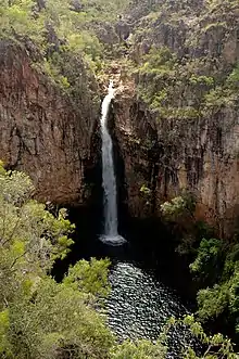 Tjaetaba Falls is a drop along Greenant Creek, one of the smaller systems in the park. These falls and the area below them is an Aboriginal sacred site, and visitors are requested to swim only above the falls.