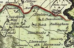 The parish borders the parishes of Harewood at the south, Llandinabo and Llanwarne at the south-west corner, the rest being Much Birch, Aconbury at the north and north-east, and Little Dewchurch and Hentland at the east. The closest villages are Kingsthorne, in the parish of Much Birch, bordering the north-east of the parish, and Little Dewchursh at the east.[9][10][11][12]