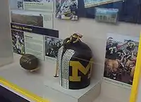 The Little Brown Jug is a trophy contested between the Michigan Wolverines football team of the University of Michigan and the Minnesota Golden Gophers football team of the University of Minnesota. The Little Brown Jug is an earthenware jug that serves as a trophy awarded to the winner of the game.[2] It is one of the oldest and most played rivalries in American college football, dating to 1892. The Little Brown Jug is the most regularly exchanged rivalry trophy in college football, the oldest trophy game in FBS college football, and the second oldest rivalry trophy overall, next to the 1899 Territorial Cup (which did not become a travelling/exchange trophy until 2001), contested between Arizona and Arizona State (which did not become a four-year college until 1925).[3]