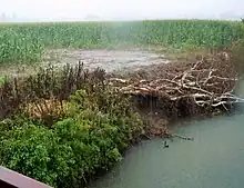 Beaver (Castor canadensis) were hunted for their fur since the era of the French trappers only to be extirpated from Indiana in the nineteenth century. In 1935 re-introductions of Wisconsin and Michigan beaver into Indiana were successful and the aquatic herbivorous mammal was spotted in the Indiana Dunes National Lakeshore beginning in 1968. Whitaker reported in 1994 that beaver were trapped in the river north of Chesterton and that he had found signs of beaver in the lower portions of the river.[9] Beaver create wetlands which remove sediment and pathogens and increase trout and salmon abundance as their ponds make ideal fish-rearing habitat. Research in the western United States, found that extensive loss of beaver ponds resulted in an 89% reduction in coho salmon (Oncorhynchus kisutch) smolt summer production and an almost equally detrimental 86% reduction in critical winter habitat carrying capacity.[10] Contrary to popular myth, most beaver dams do not pose barriers to trout and salmon migration, although they may be restricted seasonally during periods of low stream flows.[11]