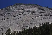 Cascade Cliffs is a wall of unjointed granite that rises to 8,170 ft (2,490 m) AMSL, 1,930 ft (588 m) above the Merced River and make up the southern wall of Little Yosemite Valley at 37°43′27.73″N 119°29′13.56″W / 37.7243694°N 119.4871000°W, 1.6 mi (3 km) southwest of Bunnell Point and 2.4 mi (4 km) northeast of Mount Starr King, of which Cascade Cliffs comprises the northern flank. In few other places in the Yosemite region is the granite more continuously massive than in the Cascade Cliffs. Only one horizontal master joint divides the rock (in the lower left) The scales on the cliffs are merely surficial features due to exfoliation. The dark streaks indicate the paths followed by the ribbon cascades which descend from the upland in the spring, when the snow is melting, and from which the cliffs take their name. There are two wide, relatively short yet quite deep arches at the bottom of the cliff.[3]