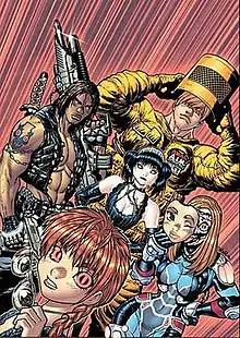 ![]() Cover to "Livewires" #1. Pictured starting from left-top Top: Hollowpoint Ninja and Cornfed. Middle: Gothic Lolita. Bottom: Stem Cell and Social Butterfly. Art by Adam Warren. | |