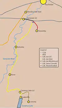 The LAL has trackage rights at CSX's Genesee Junction Yard, allowing the LAL to interchange with the Rochester and Southern Railroad as well as CSX. LAL ownership begins at the east end of Genesee Junction with the former Conrail non-controlled siding that runs parallel to the West Shore Branch from Genesee Junction Yard to MP 360. There, the line heads south onto what was once Erie-Lackawanna Railroad and Lehigh Valley Railroad trackage. Shortly after crossing Jefferson Road (NY-252), the track splits, with one track, the ex-LV Rochester Branch, heading southeast to a pair of online businesses on Lehigh Station Road (NY-253) before coming to an end, while the other track, ex-EL trackage, continues south/southwest towards Avon and eventually hits the Lakeville terminus, ending just shy of Conesus Lake, at one time a Steam Boat terminal.