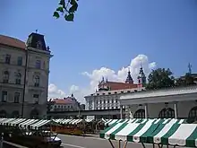 The Ljubljana Central Market (Slovene: Osrednja ljubljanska tržnica) is a market in Ljubljana, Slovenia. The riverside market building, sometimes referred to as Plečnik's Market (Slovene: Plečnikova tržnica), was designed by Jože Plečnik between 1931 and 1939.[1] It stretches between the Triple Bridge and the Dragon Bridge, on the right bank of the Ljubljanica River.[1][2] The marketplace and Vodnik Square (Slovene: Vodnikov trg), where it is located, are cultural monuments of national significance. It is partly located at Adamič and Lunder Embankment (Adamič-Lundrovo nabrežje) and at Pogačar Square (Pogačarjev trg).