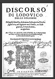 - ↑ Ludovico : delle Colombe (30 September 2018). "Discorso di Lodouico delle Colombe nel quale si dimostra, che la nuoua stella apparita l'ottobre passato 1604. nel Sagittario non è cometa, ne stella generata, ò creata di nuouo, ne apparente ma vna di quelle che furono da principio nel cielo; e ciò esser conforme alla vera filosofia, teologia, e astronomiche demostrazioni. C". nella Stamperia de' Giunti. Retrieved 30 September 2018 – via Internet Archive.