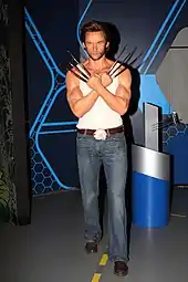 Wax figure of Hugh Jackman as Logan at Madame Tussauds. Performing the role in nine installments of the X-Men film series earned Jackman the Guinness World Record for "longest career as a live-action Marvel character".