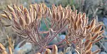 Lomatium macrocarpum is a perennial flowering plant in the carrot family known by the common names bigseed lomatium, biscuit root or bigseed biscuitroot. It is native to much of western North America, where it can be found in various types of habitat, including the grasslands of the Great Plains, and particularly in rocky areas.[1] It is a spreading or erect perennial herb growing up to about half a meter long with hairy, gray-green herbage. The grayish basal leaves[1] are up to about 24 centimetres (9.4 in) long and are intricately divided into many small, narrow segments. The inflorescence bears an umbel of yellowish, greenish, purplish, or white flowers, growing from a lateral stem.[1] The fruit is a compressed, winged, round or oval disc up to about 2 cm long.