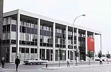 The first CN station was demolished and gave way to two structures, a three-storey building at 205 York Street (now home to the CN Credit Union) completed in 1963[4] and the 10-storey CN Tower Building at 197 York Street built in 1969.[5] The latter building, an International-style structure was closed in 2000 as CN staff dwindled and was imploded at 9:15 a.m., on February 4, 2001.[6] During demolition of the 1969 structure and construction of the present station, train services temporarily reverted to the 1963 station. The old credit union building was incorporated into the current station structure after 2001 and remaining site of the old station became a parking lot. The platform area from the previous stations were retained in the new station.