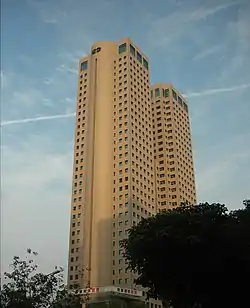 The Long-Bang Trade Plaza, also Long-Ban World Trade Building or Long-Bong Trade Plaza (Chinese: 龍邦世貿大樓; pinyin: Lóng bāng shìmào dàlóu), is a complex of twin skyscraper office buildings located in West District, Taichung, Taiwan. The buildings were completed in 1991 and were one of the earliest skyscrapers built in Taichung, as well as the first buildings to reach 150 m (490 ft) in the city. The height of each building is 160 m (520 ft), the total floor area is 70,389 m2 (757,660 sq ft), and each building comprises 37 floors above ground, as well as five basement levels.[1] The complex was designed by TMA Architects and Associates.[2] As of December 2020, the buildings are the 11th tallest buildings in Taichung.[3]