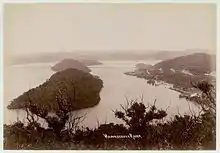 Early settlers on the island included timber getters,[5] and by 1873 there are known to have been two houses at either end of the low central saddle. These were owned by George Woods and Albert Nelson, a lime burner and boarding house operator respectively.[6] In the late 1890s, the island was briefly dedicated as the site for an inebriates asylum[7] that was ultimately built on nearby Peat Island several years later.[8]
