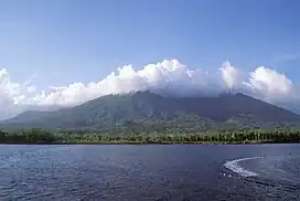 Two stratovolcanoes are located on the island: Mount Reaumur and Cerisy Peak. The summit of the volcanic complex collapsed during at least three major explosive eruptions, about 16,000, 4000, and 300 years ago. These produced a large caldera 10 x 12.5 km in size, now filled with a freshwater crater lake, Lake Wisdom. In 1953-1954 and 1968, volcanic activity created Motmot Island on the crater lake,[2] 200 x 200 m in size. The 1660 eruption was one of the largest in Papua New Guinea's recent history with an estimated air-fall volume in excess of 11 cu km,[3] comparable to the 1991 eruption of Mount Pinatubo, but the Global Volcanism Program gives a much higher estimate of 30 cu km. This cataclysmic event prompted legends of a "Time of Darkness".[4] The most recent (and a smaller) eruption occurred in 1993.