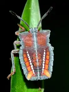 The disease is spread by litchi stink bug[10] (Tessaratoma papillosa, in the family Tessaratomidae) and longan psylla,[18] (Cornegenapsylla sinica)[12] and the virus was found in the salivary glands of those insects.[15][19] Because of the insect vectors, it is possible the virus is related to one afflicting lychee,[19] and can be spread to that species via grafting.[13] Longan gall mite (Eriophyes dimocarpi)[17] and the dodder Cuscuta campestris spreads the pathogen, as does infected pollen but not sap.[12]