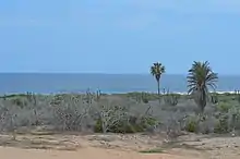 The Río San José stops just shy of the ocean, with a one km long sand bar creating an estuary, the third largest in Mexico.[20] This pooling of brackish water has created an oasis in the surrounding Sarcocaule desert. The Río San José flows largely underground for 40 miles (64 km) from its origin in the Sierra de la Laguna (Laguna Mountains), although its Miramonte River tributary adds almost an additional 10 miles (16 km). Its tributaries flow down the eastern side of the sierra and include Santa Rosa, Santa Lázaro, San Miguel, San Ignacio (at La Palma), Caduaño, Miraflores and San Bernard.[21]