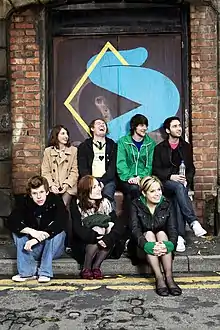 Los Campesinos! are a seven-piece indie pop band from Cardiff, Wales, formed in early 2006 at Cardiff University. The band has seen several lineup changes - Gareth Paisey (lead vocals), Neil Turner (guitar) and Tom Bromley (guitar) are the only remaining original members, now joined by Rob Taylor (guitar), Kim Paisey (keyboards, vocals), Matt Fidler (bass guitar) and Jason Adelinia (drums). All replace their surnames with "Campesinos!" as stage names.