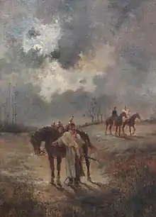 But the war, or more specifically its soldiers, clearly made a deep impression on Benassit. In the following decade he returned again and again to making watercolors and paintings of men in uniform, often on scouting missions or in retreat, and often in snow or rain. Benassit's often somber depictions are neither sentimental nor graphically violent; Charles Chincholle wrote that Benassit "shows us the ardor, the valor. He hides the price of glory under the frame."[20]