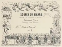 Jules-Antoine Castagnary gave high praise to Benassit's 25 illustrations (one for each hour of the day, plus a frontispiece) for Alfred Delvau's Les heures parisiennes, saying the artist, a "Parisian (not by birth, but by temperament and mentality)" displayed "all the finesse and all the crumpled grace that can be possessed by a pretty pencil-line subject to an expeditious hand. Fantasy and observation mingle in Bénassit's work, with that sort of shadowy elegance that adapts so well to the depiction of our diverse demi-mondes. No one knows better than he how to raise a skirt around two little trotting feet, nor to maliciously roll up a nose in the middle of a beggar's face. What charming pages to flip through!"[3] Before it was published, censors tried (and failed) to ban the book.[4]