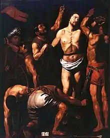 Other than the copies after Caravaggio made after 1606, there are almost no known paintings by Finson before 1610. The signed but not dated Venus and Cupid with an unlikely couple (At Dorotheum on 13 October 2010 in Vienna, lot 352) was likely made in Italy not long after his arrival in Italy and before his exposure to the naturalism of Caravaggio. It shows that at this time Finson was still influenced by the Mannerist school of painting at the court of Rudolph II in Prague, with its preference for exploring erotic motives as well as by the Mannerist style of Antwerp painters such as Jacob de Backer.[5] A Saint John the Baptist preparing himself for his martyrdom in a private collection was attributed to Finson in 2019 and is dated to approximately 1607. It shows Finson's confrontation with the work of Caravaggio. The painting offers an original interpretation of the subject. The foreground is dominated by the nude torso of the saint, shown in a submissive pose a few moments before his beheading. On the left are the heads of Salome and the old maid, who is close to the old maid in Caravaggio's File:Salome with the Head of John the Baptist-Caravaggio in the National Gallery in London.[12] A Caravaggesque painting of the Martyrdom of Saint Sebastian (Parish church of Rougiers, France) was previously dated 1615 but has now been dated 1610. This would place it in the Italian period of the artist.[5][12]