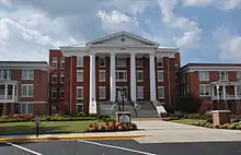 In 1855, the property of Louisburg Female Academy was transferred to the Louisburg Female College Company; the newly formed body, Louisburg Female College, opened its doors in 1857. A four-story, fifty-room brick Greek Revival-style building for the female college was constructed in 1857 on the west campus where the female academy building had formerly stood. Old Main, the central building of the Female Academy is still in use today as the administrative building of Louisburg College.[2] Old Main was listed on the National Register of Historic Places in 1978.[1] It is located in the Louisburg Historic District.