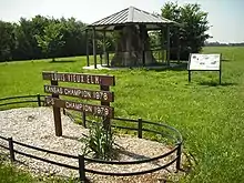 About three miles east of Louisville was the Vermillion Crossing of the Oregon Trail operated by Louis Vieux. Vieux is buried in the Vieux Family Cemetery on top of a hill. Nearby, on the banks of the river, is a cholera cemetery from 1849, which is estimated to contain at least fifty graves, although only two stones—both native sandstones—remain. The Louis Vieux Elm Tree is across the river and is estimated to be over 300 years old. The tree had been afflicted with Dutch elm disease, a lightning strike and vandalism and efforts were taken to protect and shelter the tree's stump. In August 2011, the stump was destroyed by fire.[6] Near the tree are the graves of seven unknown soldiers.