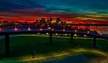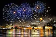Louisville Waterfront Park is both a non-profit organization and an 85-acre (340,000 m2)[1] public park adjacent to the downtown area of Louisville, Kentucky and the Ohio River. Specifically, it is adjacent to Louisville's wharf and Riverfront Plaza/Belvedere, which are situated to the west of the park. Once a wasteland of scrap yards and abandoned industrial buildings, Waterfront Park is now a vibrant green space that welcomes over 2.2 million visitors each year. Located in the park is the Big Four Bridge which connects the city of Louisville with the City of Jeffersonville, Indiana. Waterfront Park is home to some of Louisville's most exciting celebrations, such as the Fourth of July at Waterfront Park, Forecastle Festival, WFPK Waterfront Wednesdays and Thunder Over Louisville.[1] In 2013 the park won the Rudy Bruner Award for Urban Excellence a national design award that seeks to identify and honor places that address economic and social concerns in urban design.[2]