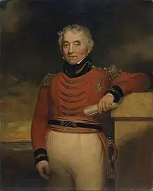 The Vice Admiral fought in North America for the British, capturing number of coasters as Commander of HMS Plantagenet, and joined the Chesapeake campaign. He served under Major General Edward Pakenham, the brother-in-law of the Duke of Wellington, and brought back the bodies of Pakenham and General Edward Gibbs to England.[20] He was also a Royal navy Admiral during the Glorious First of June, the Anglo French War, the Invasion of France (1795), and the Napoleonic Wars against Napoleon Bonaparte, commanding HMS Racoon (1795) and other vessels.[21][22]