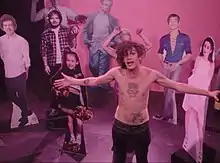 The music video opens with various shots of the 1975 performing "Love Me" together, a woman dancing with a floating guitar and Healy singing in front of a troupe of women.[52] The singer prances around shirtless, wearing leather trousers.[54] In certain shots, Healy is shown with his chest covered in stamps showing a headshot of an old photo of himself. The clip is evocative of Richey Edwards' NME cover photo, in which his torso is covered in ink versions of Marilyn Monroe.[54] Singing the lyrics "I'm just with my friends online", he gestures to cardboard cutouts of Harry Styles, Rita Ora, Miley Cyrus, Charli XCX, Ed Sheeran and Elvis Presley, among others.[54][55][56] Healy proceeds to kiss the cutout of Styles.[52][54] In the second verse, the visual is interspersed with shots of a pink hot tub, which is variously filled with the 1975 and Healy with a leotard-clad girl.[52][54] Additionally, two women are shown dancing with giant yellow balloons that spell the band's name.[52] Healy pours out champagne in several scenes, handing a glass to Presley at one point that ends up in a puddle on the floor.[54] During the guitar solo, Daniel mocks selfie culture by holding up a selfie stick and pouting for the camera, continuing to drum with one hand.[52][54]
