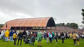 The Alpha is the largest stage at Lowlands festival, with a capacity of 15,000 attendees. It succeeded the "Hoofdpodium" (main stage) in 1993. The blue and yellow striped circus tent (on the left) was replaced in 2017 by a higher, more open tent with arched roof (on the right).[23]