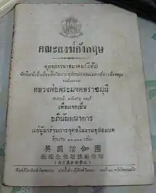 Soon after his appointment as temporary abbot, he was appointed fully as abbot of Wat Paknam, where he remained until his death in 1959.[7] For his life and work he was given monastic and royal honorific names, that is Phrakhru Samanadham-samathan (in 1921), Phrabhavanakosolthera (in 1949), Phramongkolratmuni (in 1955), and finally Phramongkolthepmuni (in 1957).[53][54][55] The last three royal titles were given late, due to the fact that the temple was not under royal patronage, and therefore received less attention from the royal family than other temples.[56][57][note 7]