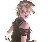 In the video, Madonna wore a black outfit consisting of a mesh crop top, fingerless lace gloves, skirt over leggings, and stars and crucifixes dangling from her ears and around her waist.[68] Although Belle was credited with coming up with the ensemble, biographer Mary Cross noted that Madonna was wearing her "day-to-day" clothing.[64] At the time of the song's release, the singer's fashion was catching on as a statement among club kids and her fans, with the crucifixes she wore as earrings being the most prominent; Madonna herself commented that, "[wearing a crucifix] was kind of offbeat and interesting. I mean, everything I do is sort of tongue-in-cheek. Besides, [the crucifixes] seem to go with my name."[64] Cross, however, wrote that the singer was trying to find a distinctive image for herself, and stand out among artists like Boy George, Cyndi Lauper, and David Bowie.[64] "Lucky Star" was added to MTV the week of June 2, 1984;[69] afterwards, it was added to Madonna's video compilations The Immaculate Collection (1990) and Celebration: The Video Collection (2009).[65][26]