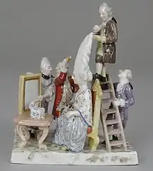 The original manufactory became famous for its figurines,[4] which are interesting because they very likely were modelled directly on the costumes used in the court ballet, another enthusiasm of Duke Charles Eugene. Between 1760 and 1766 he had managed to entice to Stuttgart the innovative choreographer and ballet master Jean-Georges Noverre, then out of favour in Paris. One of Noverre's innovations was using lighter costumes allowing the dancer to move freely, shown in some of the figure groups, as the one illustrated here, but not all.[5]