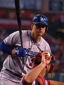 Cruz signed a minor league contract with the Los Angeles Dodgers on November 20, 2011. After failing to make the Dodgers opening day roster, he was assigned to the AAA Albuquerque Isotopes, where he hit .318 and was selected to the Pacific Coast League mid-season All-Star team.[2] He was called up to the Dodgers on July 2, 2012 when the Dodgers shortstop, Dee Gordon, was injured. The following day he stole home after doubling in a game against the Cincinnati Reds.[3] He hit his first Major League home run on July 20 against Johan Santana of the New York Mets. Cruz remained in the starting lineup the rest of the season, first at shortstop and then switching over to third base when the Dodgers acquired Hanley Ramírez. Cruz's underdog success during 2012 led the home crowds at Dodger Stadium to chant "Cruuuuuz" when he came up to bat and the Dodgers began selling his replica jersey in the gift shop.[4] On the season, he played in 78 games and hit .297 with 6 home runs and 40 RBI.
