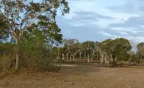 The forest of Lunugamvehera national park characterized by several forest layers.[2] Mosaic of scrubland and grassland make up these forests.[1] Some of the plant species of the forest are Drypetes sepiaria, Manilkara hexandra, Schleichera oleosa, Lannea coromandelica, Diospyros ovalifolia, Polyalthia korinti, Carmona microphylla, Croton lacciterus, and Coffea wightiana. Grassland area contains several species of grasses. Chloris montana, Cynodon dactylon, Panicum maximum, Imperata cylindrica, Lantana camara, Chromolaena odorata, Mimosa pudica, Carmona microphylla, and Securinega leucopyrus are common in abandoned chena lands. Teak and eucalyptus plantations are now common in the forest.