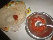 Lunumiris (Sinhala:ලුණු මිරිස් [lunu-miris] means salt and chillies in Sinhalese. Traditionally it is made with ground chillies and salt mixed together into a paste. Some also refer it as katta sambol, but katta sambol is a different condiment. Katta sambol (Sinhala:කට්ට සම්බෝල [kaṭṭa sambōla]) is a spicy Sri Lankan sambol served as a condiment. It consists of chili pepper, shallots, Maldives fish, sea salt, black pepper and lime juice, usually ground with a mortar and pestle or a grind stone.
